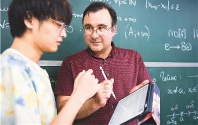 2018年,俄罗斯莫斯科罗蒙诺索夫国立大学的布达克来到深圳加入新建立的深圳北理莫斯科大学,成为计算数学与控制系一名教授。布达克未来的目标,是在这里培养更多创新人才。图为2020年9月28日,布达克(右)课后为学生答疑。