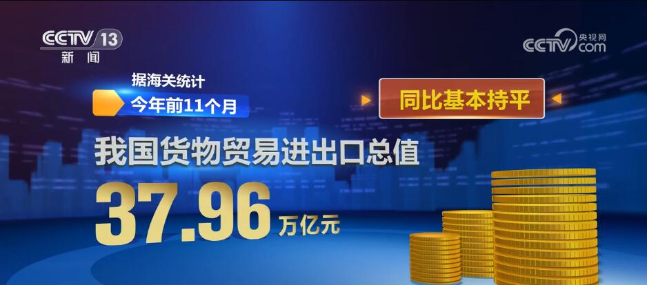 据海关统计,今年前11个月,我国货物贸易进出口总值37.96万亿元,同比基本持平。其中,出口21.6万亿元,增长0.3%;进口16.36万亿元,下降0.5%。